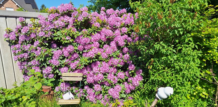 Endlich! Nach mehr als fünf Jahren steht unsere geliebte kleine Rhododendronhecke mal wieder in voller Blüte. Schuld am vorherigen „Kränkeln“ war ein hübsch buntes kleines Tierchen: die Rhododendron-Zikade.