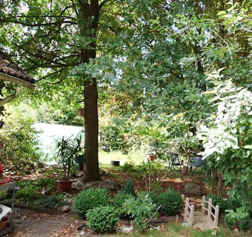 Die Schuldige war schnell ausgemacht: Unsere schöne Eiche, die vor mehr als 20 Jahren von einem Eichhörnchen dicht neben dem Haus gepflanzt wurde, überwuchert mittlerweile nicht nur das Dach, sondern dient auch im Rest des Gartens als Schattenspender. Ja, eine wahrlich prächtige „Deutsche Eiche“! Was tun? Die Eiche zu fällen, lässt mein Herz bluten, den Garten deshalb aufzugeben, beraubt mich meines liebsten Hobbys.