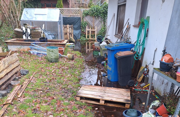 Ihr habt es sicher aus den Nachrichten mitbekommen: Ende Dezember stand gefühlt halb Niedersachsen unter Wasser. Da unser Grundstück ziemlich tief liegt und der Grundwasserspiegel entsprechend hoch ist, stand das Wasser auch hier schnell an der Oberfläche. Hinzu kommt, dass auf dem zuvor parkähnlichen Grundstück nebenan im vergangenen Jahr vier neue Einfamilienhäuser gebaut wurden. Versiegelter Boden ist nicht gerade dienlich bei Regen …