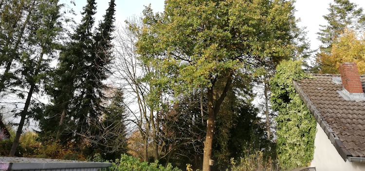 Unser guter alter Freund, der Baum, darf weiterleben! Gemeinsam mit unserem die Säge schwingenden Nachbarn haben wir die Eiche vor unserem Haus begnadigt.