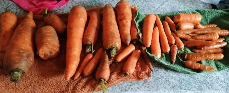 Heute war ich auf einem Karottenacker ganz in der Nähe. Am Rand lag ein großer Berg Steine, die offensichtlich von der Erntemaschine ausgesiebt worden waren. Dazwischen kiloweise Karotten, die als zu groß, zu klein, zu krumm, zu ungleichmäßig oder als von der Erntemaschine beschädigt aussortiert worden waren. Es dauerte kaum fünf Minuten und ich hatte mehr als sechs Pfund leckere Möhren (Foto) in meinem Korb. Vor der Verwesung gerettetes Gemüse zum Nulltarif. Wir werden es genießen!